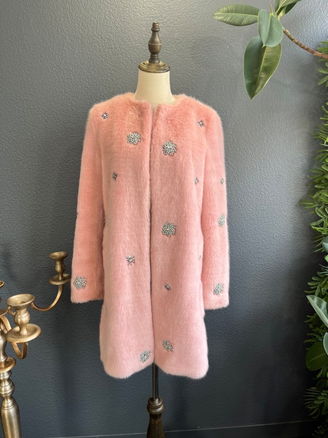 フェイクファーコート。淡ピンク×ビジュー。 ドレスの上に羽織ったり、カジュアルな足元に合わせたり。 近年流行りのエコファー。 ■□ATTENTION□■ 古着特有の使用感や経年変化等もございますが、こちらも含めて楽しんで頂けたらと思います。 商品等の、ご質問はトップページのcontactからお問い合わせ頂く事が出来ますので是非ご利用ください。 月島にオフィスを構えております。 お近くの方はご試着して頂けます。CONTACTページよりお気軽にご予約ください。