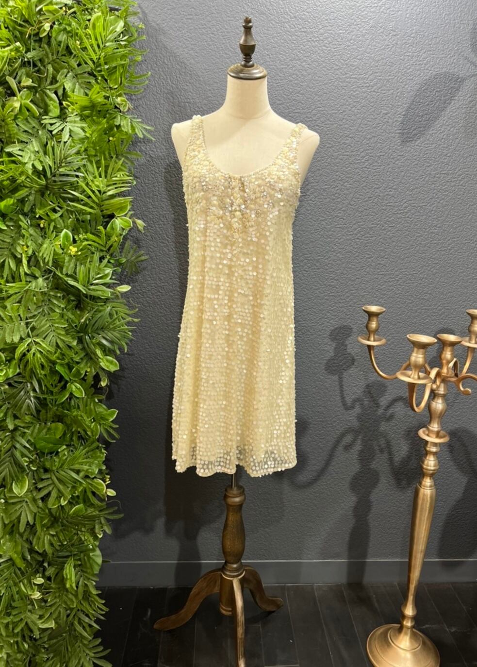 全面にビジューが施されたアイボリー色の素敵ドレス。