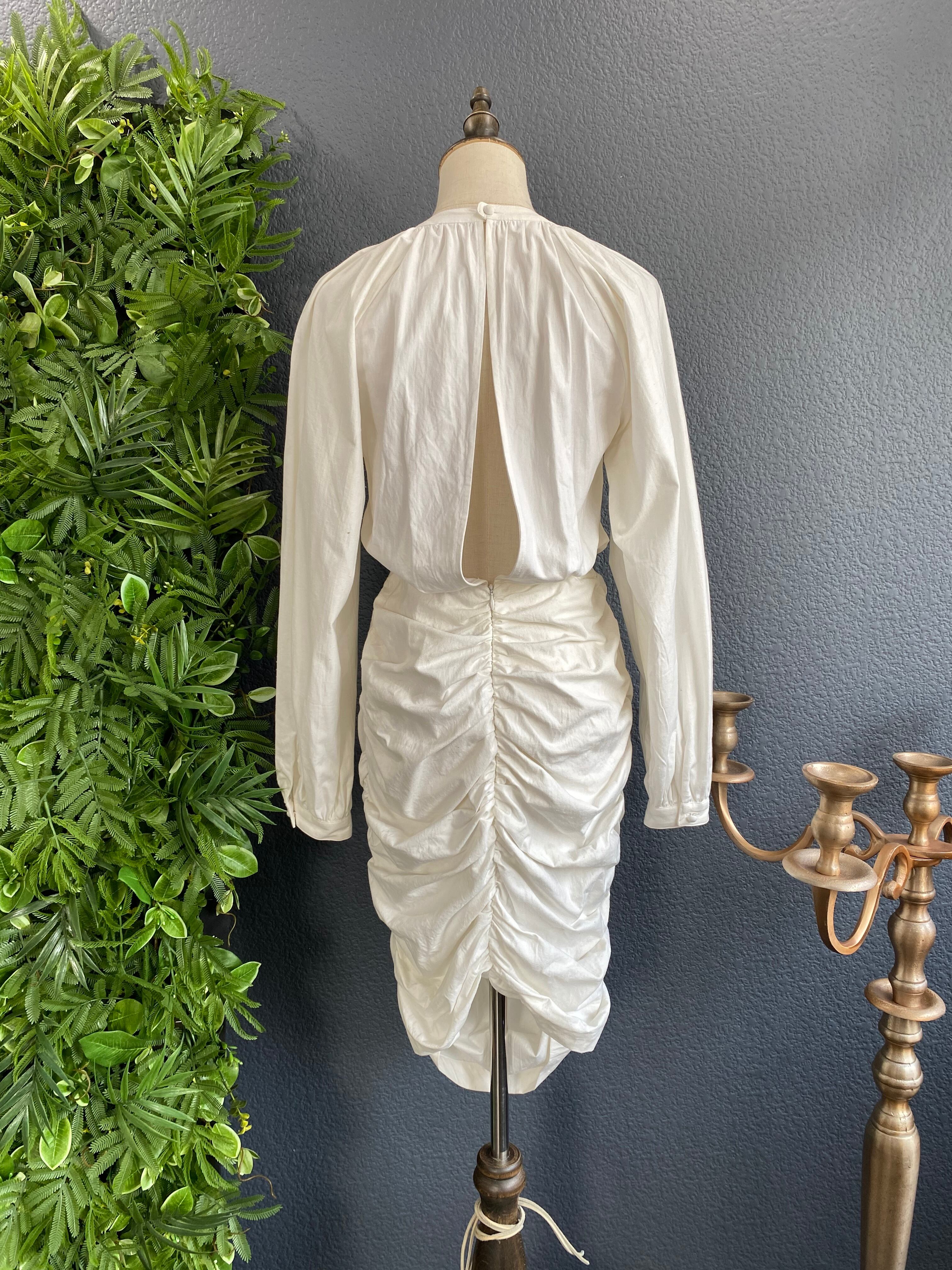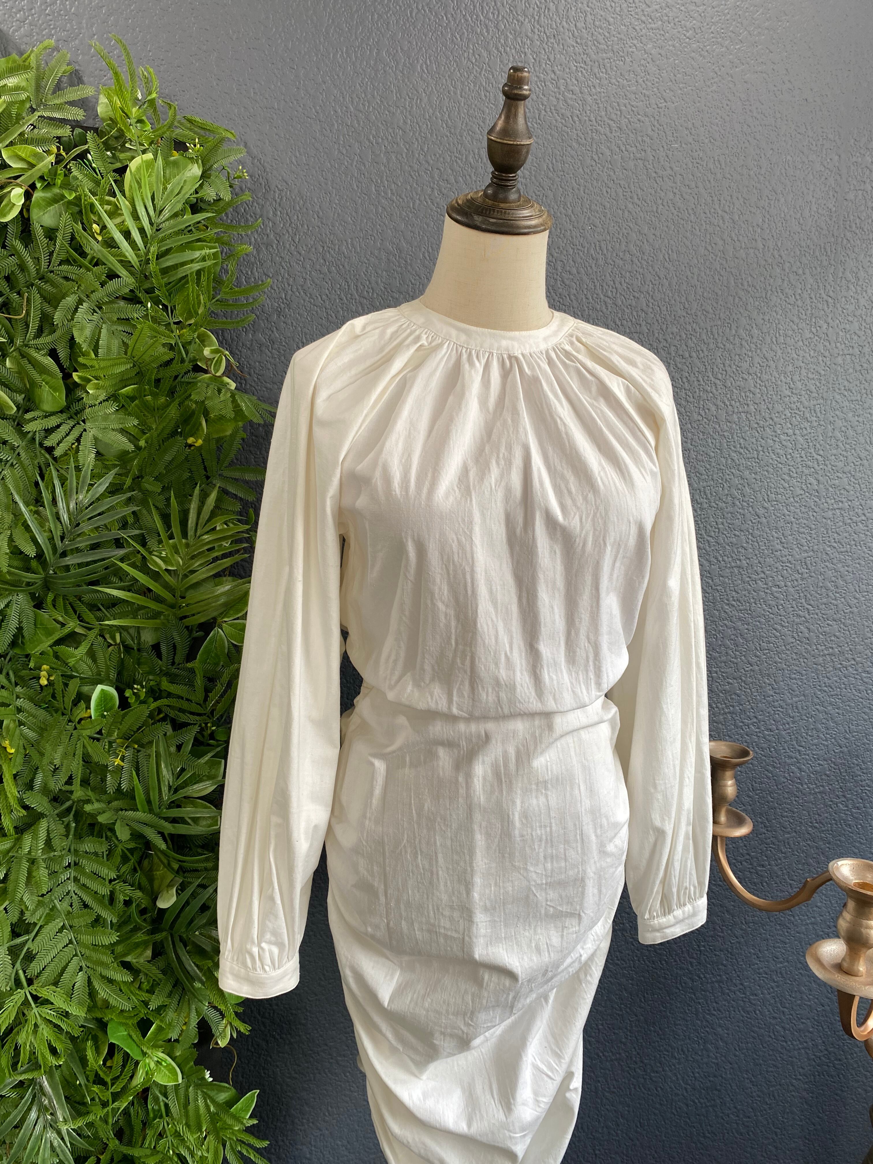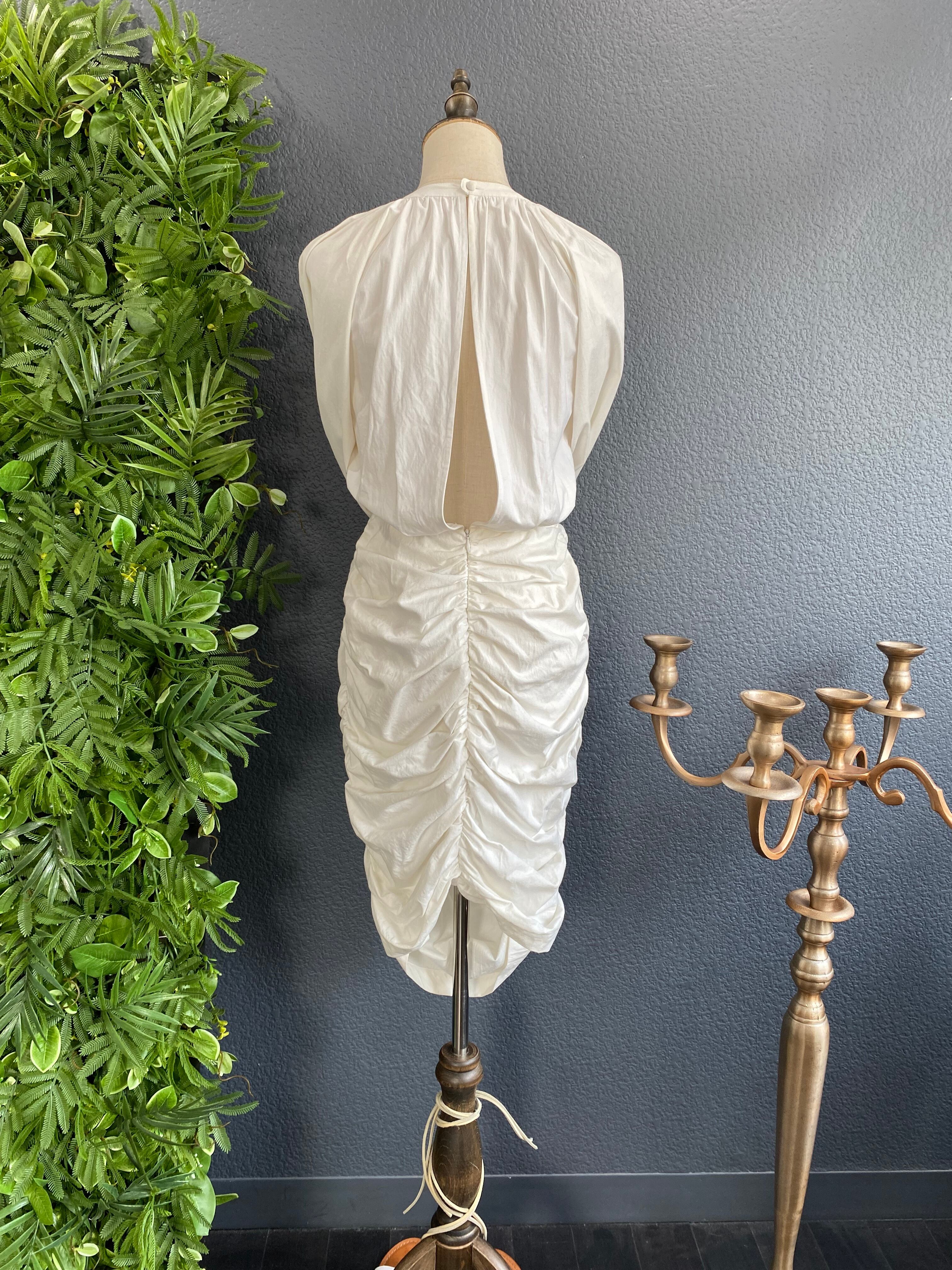 スカートのブラウジングのデザイン、パックリ開いたバックデザインが魅力的なワンピース。